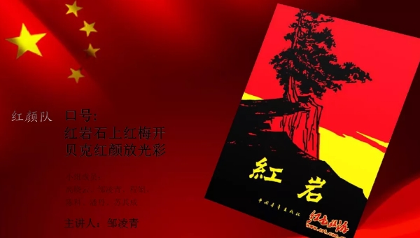 “紅巖石上紅梅開,貝克紅顏放光彩!”隨著整齊押韻的女聲口號響起,第一組紅顏隊的鄒凌青同志開始分享《紅巖》讀書心得,她談到了書中小蘿卜頭、江姐、許云峰他們鋼鐵般的意志和頑強奮斗的精神;學(xué)習(xí)《紅巖》,我們要學(xué)習(xí)江姐巾幗不讓須眉的奉獻(xiàn)精神,她還結(jié)合工作實際,“越是困難的時候,就越需要堅定不移的精神去克服和開拓!越是荊棘滿布,越是要不畏艱險,迎難而上!”