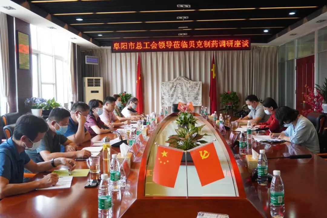 8月3日上午,阜陽市總工會黨組成員、副主席王玲玲一行來到貝克制藥調(diào)研,太和縣政協(xié)主席、縣總工會主席鮑黎,太和縣總工會黨組成員、經(jīng)審會主任鞏偉,國家稅務(wù)總局太和縣稅務(wù)局工會主席王峰,太和縣三塔鎮(zhèn)工會聯(lián)合會副主席張如君等領(lǐng)導(dǎo)參與調(diào)研座談。貝克制藥工會主席張華全程接待。