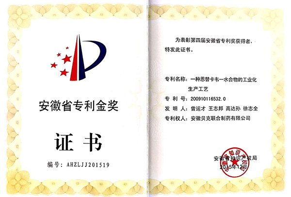 安徽省專(zhuān)利金獎(jiǎng)證書(shū)